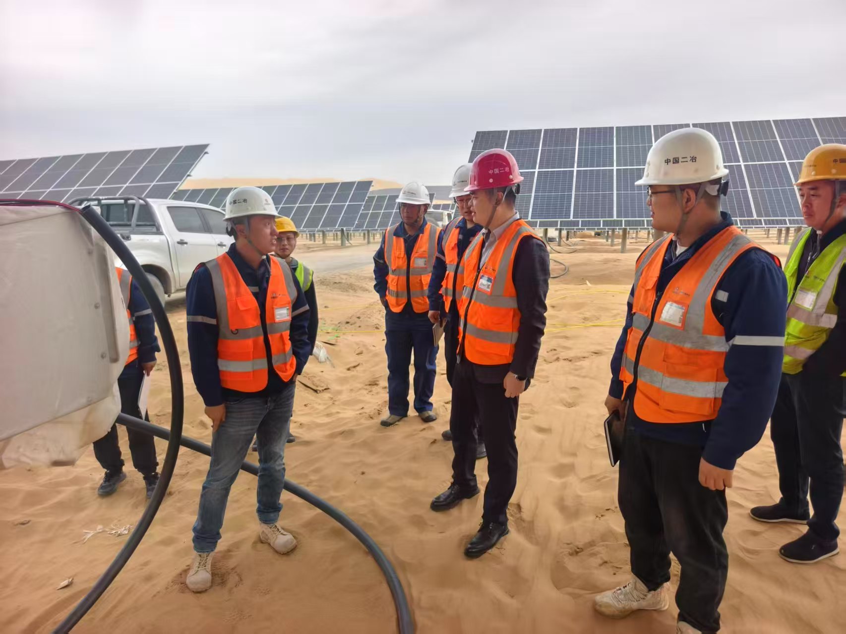 米宏達深入各子陣查看光伏組件的安裝質(zhì)量和布局情況,確保光伏組件的安裝符合標準,以提高發(fā)電效率。同時,針對項目建設(shè)核心需求,米宏達提出三點要求,一是安全管理上,需針對沙漠施工風沙、高溫等風險,加強人員安全教育培訓與現(xiàn)場管控,增設(shè)警示標志、配齊防護設(shè)備,守住安全生命線;二是質(zhì)量把控上,堅持“質(zhì)量第一”,從設(shè)備采購到安裝調(diào)試全環(huán)節(jié)嚴把關(guān),建立問題臺賬實行閉環(huán)管理,打造高標準工程;三是進度推進上,圍繞2025年11月15日并網(wǎng)目標,制定詳細施工計劃,加強多部門協(xié)調(diào),快速解決建設(shè)難題,確保按期完工。?