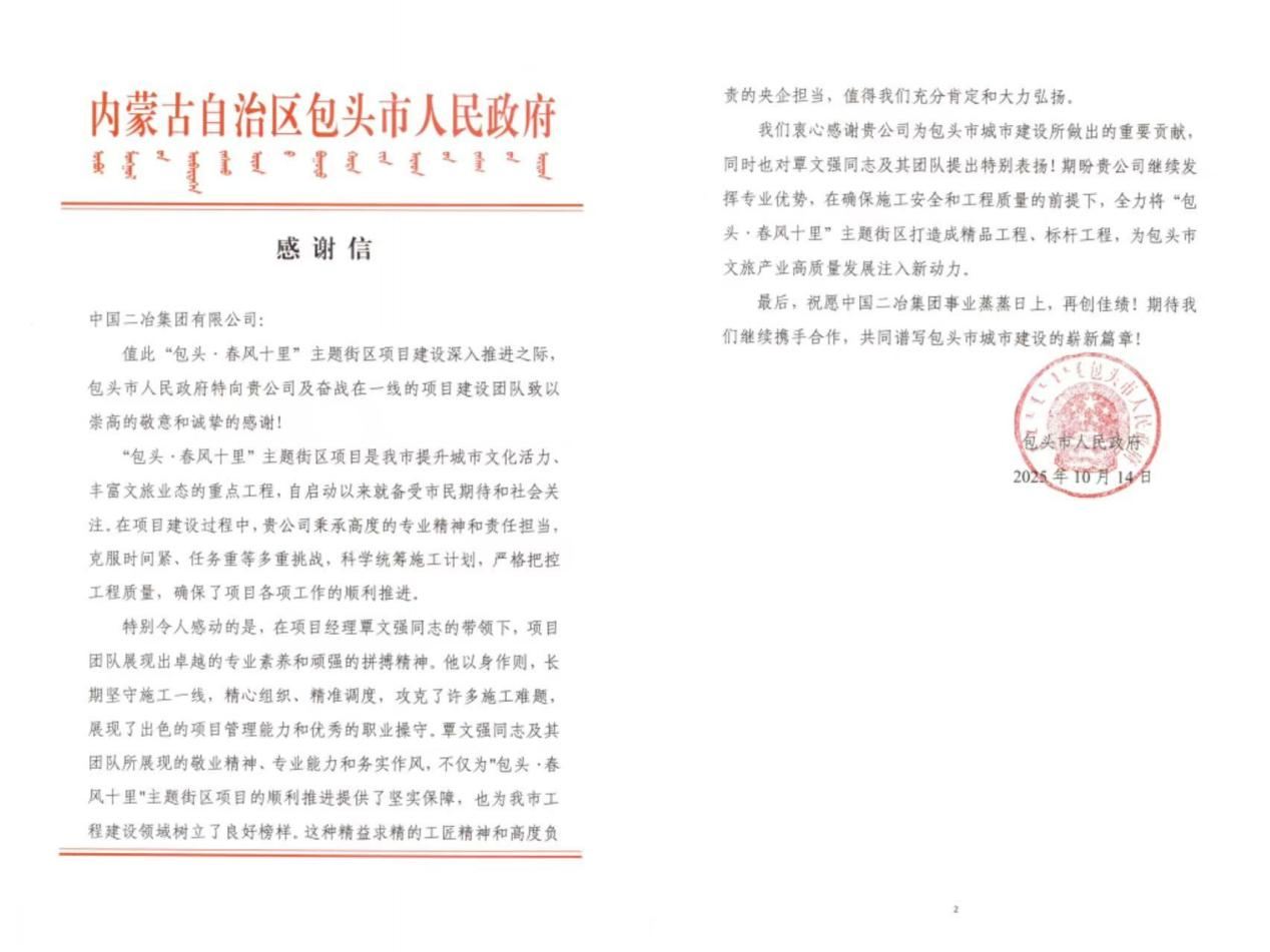 這封感謝信不僅是對(duì)中國(guó)二冶項(xiàng)目團(tuán)隊(duì)攻堅(jiān)克難、高效履約的高度認(rèn)可,更是對(duì)中國(guó)二冶秉持工匠精神、踐行央企責(zé)任擔(dān)當(dāng)?shù)挠辛τ∽C。中國(guó)二冶將以此為激勵(lì),持續(xù)發(fā)揮專(zhuān)業(yè)優(yōu)勢(shì),在嚴(yán)守施工安全與工程質(zhì)量的前提下,全力將“包頭?春風(fēng)十里”主題街區(qū)打造成精品工程、標(biāo)桿工程,為包頭市文旅產(chǎn)業(yè)高質(zhì)量發(fā)展注入更多二冶力量。