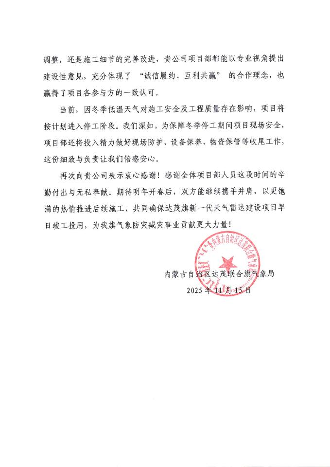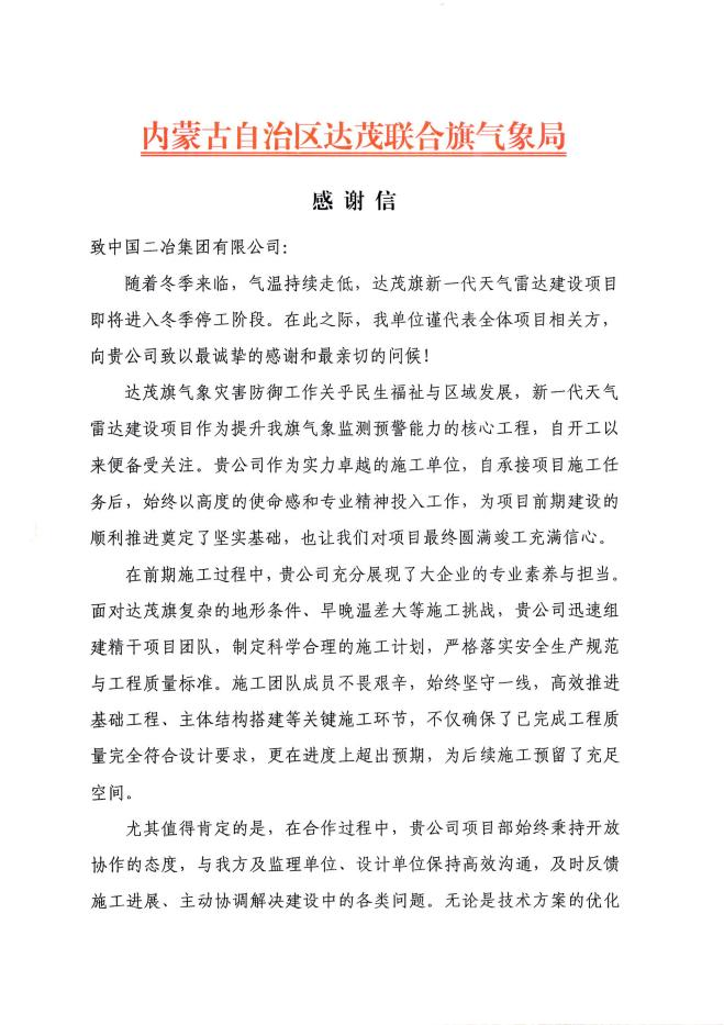11 月 16 日,中國二冶收到內(nèi)蒙古自治區(qū)達(dá)茂聯(lián)合旗氣象局發(fā)來的感謝信,信中對公司在達(dá)茂旗新一代天氣雷達(dá)建設(shè)項(xiàng)目施工中的專業(yè)表現(xiàn)與辛勤付出給予高度肯定,并致以誠摯感謝。
